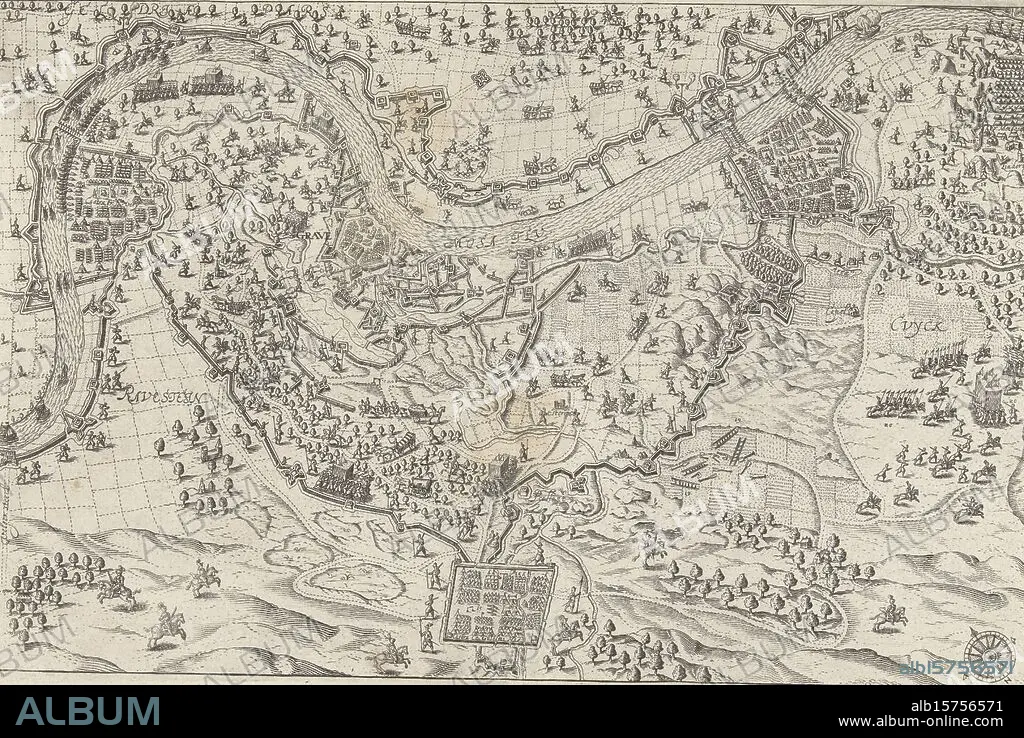 Siege and capture of Grave by Maurits, 1602, Siege and capture of the city of Grave by the Dutch army under Prince Maurits, July 18 - September 20, 1602. Plan of the city of Grave in the surrounding country with the Maas at the top. With the camps of the besiegers. Without the legend under the performance., print, print maker: Bartholomeus Willemsz. Dolendo, (attributed to), Northern Netherlands, 1602 - 1610 and/or 1619, paper, engraving, letterpress printing, height, 225 mm × width, 338 mm
