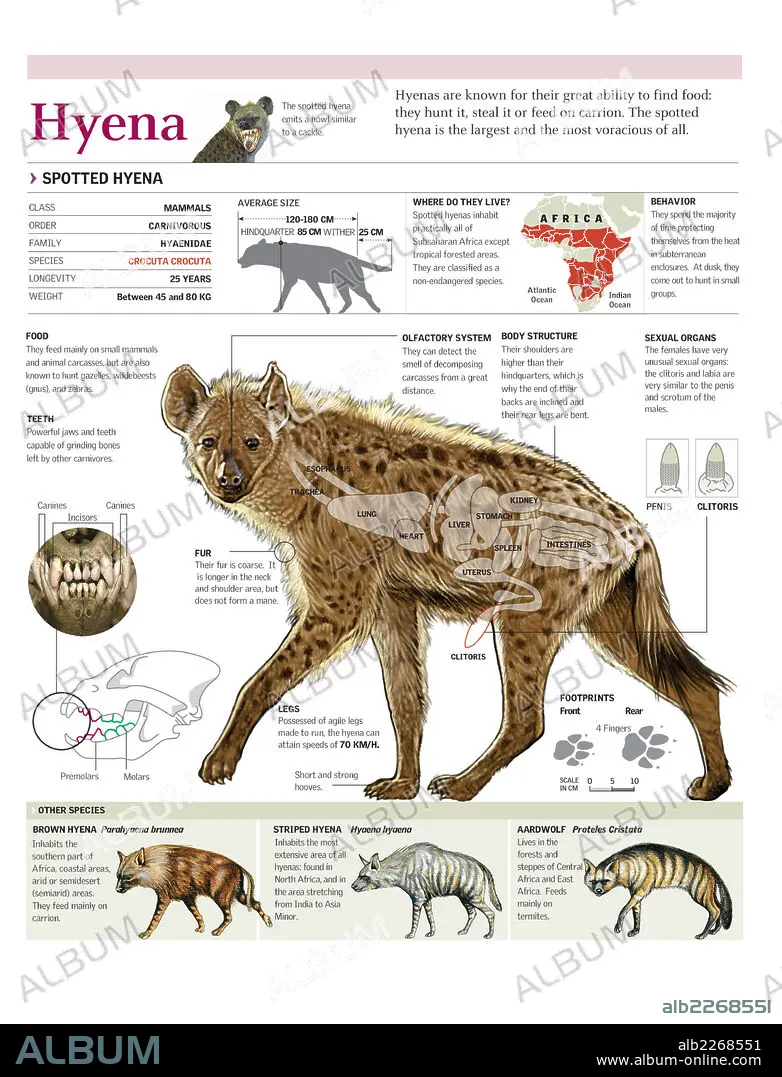 Infografía de la anatomía, distribución y dentición de la hiena manchada.