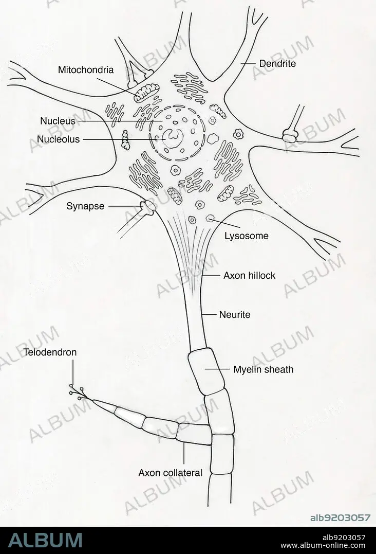 Illustration of a motor neuron, showing mitochondria, dendrites, nucleus, nucleolus, synapses, lysosomes, granular endoplasmic reticulum, axon hillock, neurite, perikaryon (initial segment), myelin sheath, axon collateral, and telodendron. A motor neuron (or motoneuron) is a neuron whose cell body is located in the spinal cord and whose fiber (axon) projects outside the spinal cord to directly or indirectly control effector organs, mainly muscles and glands. Motor neurons' axons are efferent nerve fibers that carry signals from the spinal cord to the effectors to produce effects. Types of motor neurons are alpha motor neurons, beta motor neurons, and gamma motor neurons.