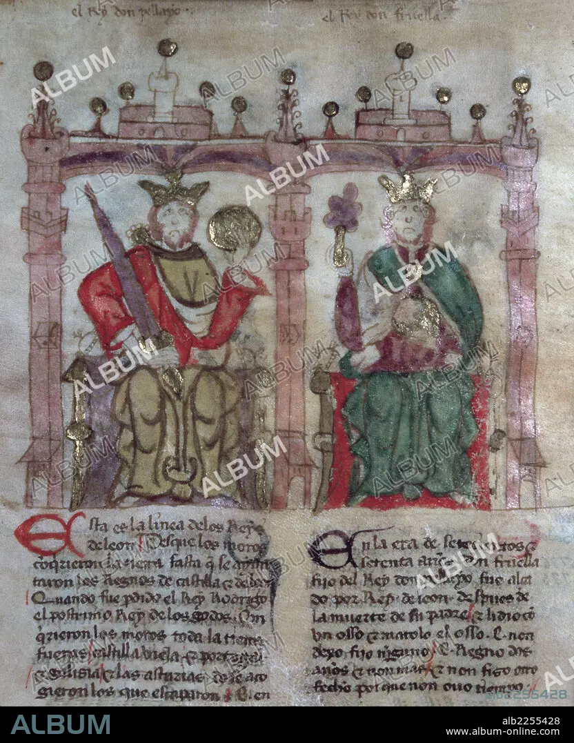 PELAYO , DON ( IZQUIERDA ). FUNDADOR DEL REINO DE ASTURIAS. MUERTO EN EL AÑO 737. FRUELA I ( DERECHA ). REY ASTURIANO. 757 -767. MINIATURA DE " SEMBLANZAS DE REYES ". BIBLIOTECA NACIONAL. MADRID.