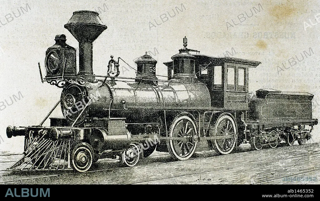 Descripción: Tipo de las locomotoras del ferrocarril directo de Madrid a Zaragoza y Barcelona. Dibujo R. Loewenstein. La Ilustración 1881. Grabado.