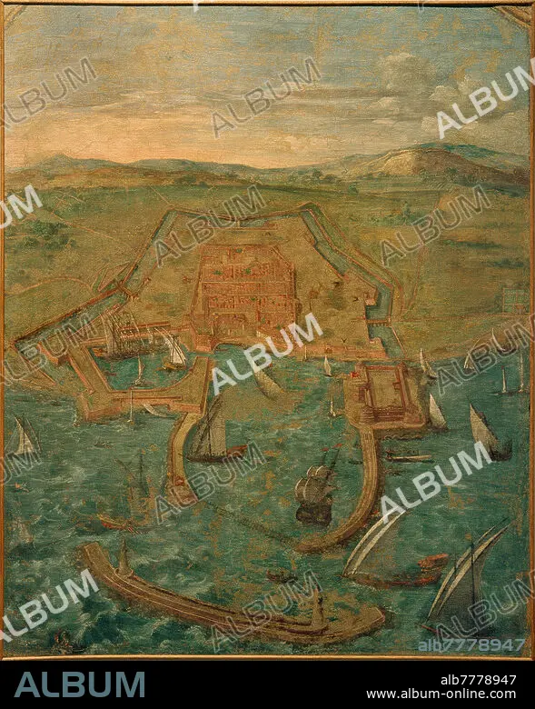 Civitavecchia (Provinz Rom, Latium, Italien). "Ansicht von Civitavecchia". Teil eines 32-teiligen Zyklus mit Veduten aus den Korridorendes Quirinalpalasts. Fresko, 1634-1635, von Marco Tullio Montagna (1584-1659) undSimone Lagi (nachgewiesen 1620 - 1640). Auf Leinwand übertragen, 168 × 133 cm. Inv. Nr. ODSG. 205; Rom, Palazzo del Quirinale.