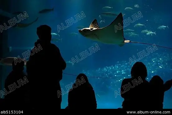 Silhouettes of visitors in front of a large aquarium with fish, Spotted eagle ray (Aetobatus narinari) swimming by, Osaka Aquarium Kaiyukan, Osaka, Japan, Asia.