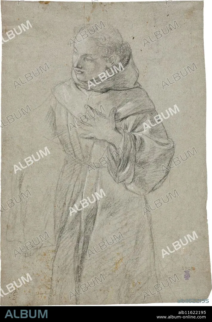 ANTONIO GONZÁLEZ RUIZ. Antonio González Ruiz / 'Santo Monje en oración (¿San Antonio?) / Calavera sobre paño, estudio de mano y Susana y los viejos'. Siglo XVIII. Lápiz negro, Clarión sobre papel agrisado, 405 x 270 mm.