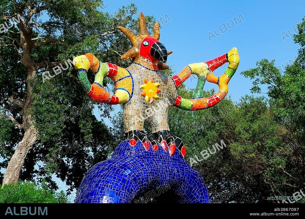Colorful sculpture in the Giardino dei Tarocchi or Garden of the Tarot, by Niki de Saint Phalle and Jean Tinguely in Capalbio, Province of Grosseto, Tuscany, Italy, Europe
