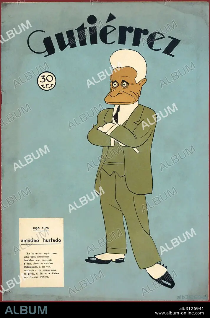 Descripción: Portada de la revista satírica Gutiérrez. Caricatura de Amadeo Hurtado Miró (1875-1950), abogado y político. Año 1933. Dibujo de K-Hito.
