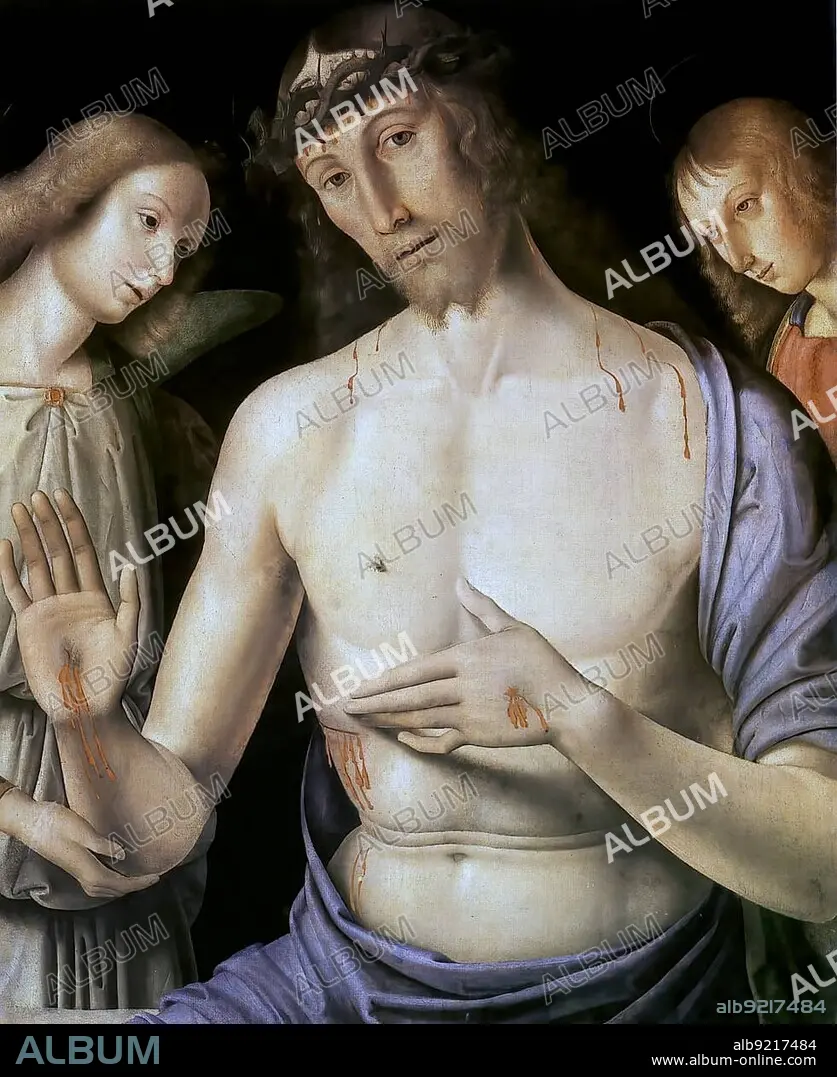 Man of Sorrows with Two Angels, c. 1490, Jesus Christ surrounded by two angels, painting by Giovanni Santi, 1435 to 1494, an Italian painter of the Umbrian school and father of Raphael, Historical, digitally restored reproduction of a 19th century original, exact date unknown.