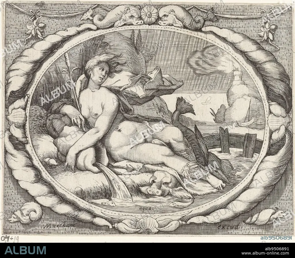 The personification of the element water (aqua): a female figure lying by a stream with fish. Next to her is a shell from which water is flowing. In the background a sky with rain and two boats. First print from a series of the four elements, Water (Aqua) Aqua The four elements , print maker: Jacob Matham, (workshop of), intermediary draughtsman: Jacob Matham, publisher: Jacob Matham, (mentioned on object), Haarlem, 1606 - 1610, paper, engraving, h 119 mm × w 148 mm.