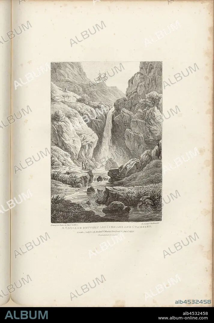 A waterfall between Les Echelles and Chambéry, Waterfall between Les Echelles and Chambéry, Signed: Major Cockburn, C. Hullmandel, Lithograph, Part 2 (Mont Cenis), Taf. 13, Cockburn, James (del.); Hullmandel, Charles Joseph (lith.), 1822, James Cockburn, Views to illustrate the route of the Simplon; Views to illustrate the route of Mount Cenis. London: Rodwell & Martin, 1822