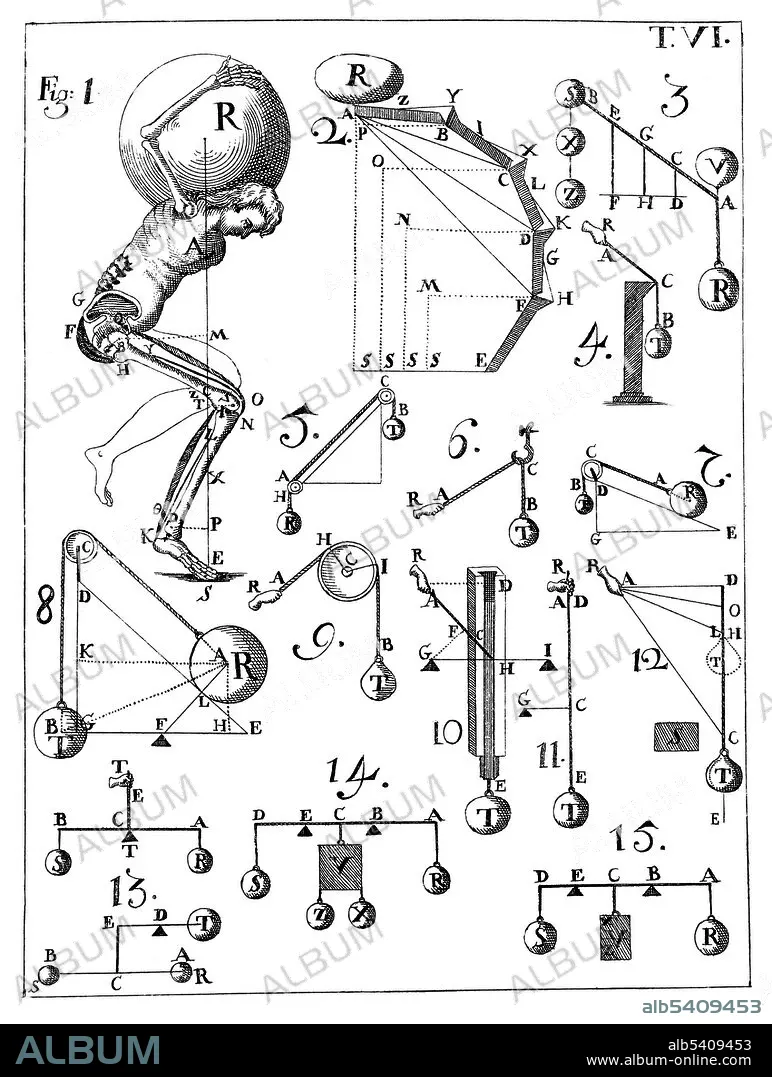 Traducción automática: De motu animalium, edición de 1734. Cuadro VI. Giovanni Alfonso Borelli (28 de enero de 1608 - 31 de diciembre de 1679) fue un fisiólogo, físico y matemático italiano del Renacimiento. Contribuyó al principio moderno de la investigación científica al continuar con la costumbre de Galileo de contrastar las hipótesis con la observación. Borelli, formado en matemáticas, también realizó amplios estudios de las lunas de Júpiter, de la mecánica de la locomoción animal y, en microscopía, de los constituyentes de la sangre. También utilizó la microscopía para investigar el movimiento estomático de las plantas y realizó estudios de medicina y geología. Durante su carrera gozó de la protección de la reina Cristina de Suecia, que le protegió de los ataques de las autoridades italianas que sufrió Galileo. Los principales logros científicos de Borelli se centran en su investigación sobre la biomecánica. Por sus publicaciones, De Motu Animalium I y De Motu Animalium II (publicadas póstumamente), Borelli es considerado el padre de la biomecánica moderna. Murió en 1679 a la edad de 71 años.