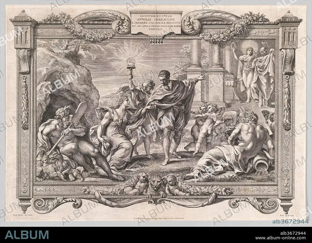 Giovanni Pietro Bellori, the antiquarian and art critic who had organized the publication with de' Rossi and written the accompanying text, had recently published a series of artists' lives that also sought to promote Annibale as the ideal painter whose revival of the tradition of Raphael should be a model for all artists. Carlo Maratti, the successful painter and leader of the Roman Academy who designed this allegory, had been trained in the Carracci tradition, and wished to uphold that tradition in the face of other artistic trends prominent in Rome. The highly skilled Sicilian printmaker Pietro Aquila was a friend of Maratti and frequently collaborated with Bellori.