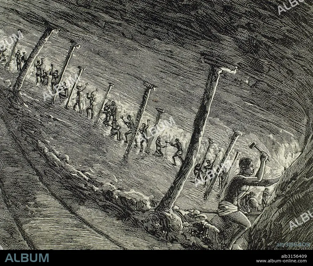 ESCLAVOS trabajando en el interior de una mina de oro. Grabado del siglo XIX. "La Ilustración Artística".