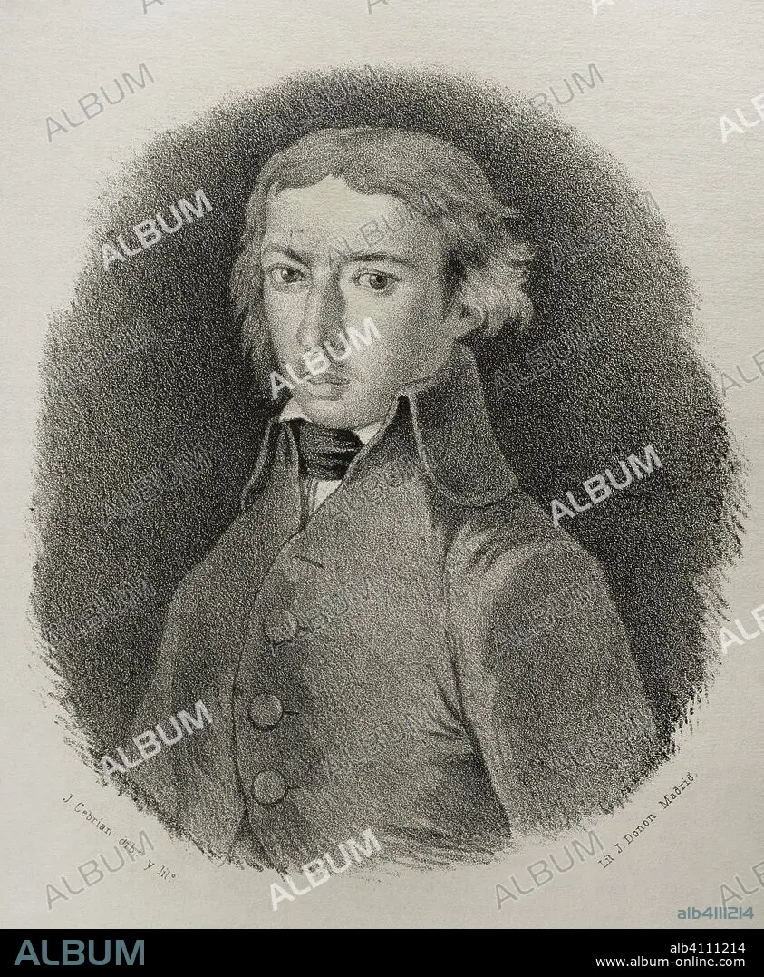 Descripción: Leandro Fernández de Moratín (Madrid, 1760-París, 1828). Dramaturgo y poeta español. Dibujo por J. Cebrián. Litografía. Crónica General de España, Historia Ilustrada y Descriptiva de sus Provincias. Castilla-La Nueva, 1869. Biblioteca Histórico Militar de Barcelona, Cataluña, España.