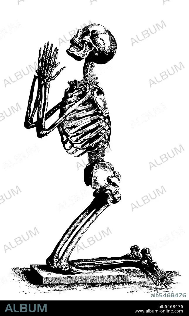 Título: Europe: A woodcut depicting a praying skeleton, probably symbolic of the 'Black death', anon., c. 15th century
