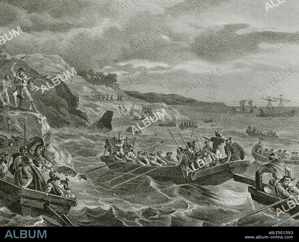 Historia de los Cartagineses (siglos VI-V a. C.). Islas Baleares. A estas islas habían llegado los griegos aunque no se asentaron en ellas. Fueron los cartagineses quienes sí se asentaron, principalmente en Ibiza (Ebysos). Fundaron en Mallorca la colonia "Na Guardis". Esta colonia sirvio a Aníbal Barca para la lucha contra Roma. Ataque y conquista de las Baleares por los cartagineses (247-183 a. C.). Grabado, año 1871.