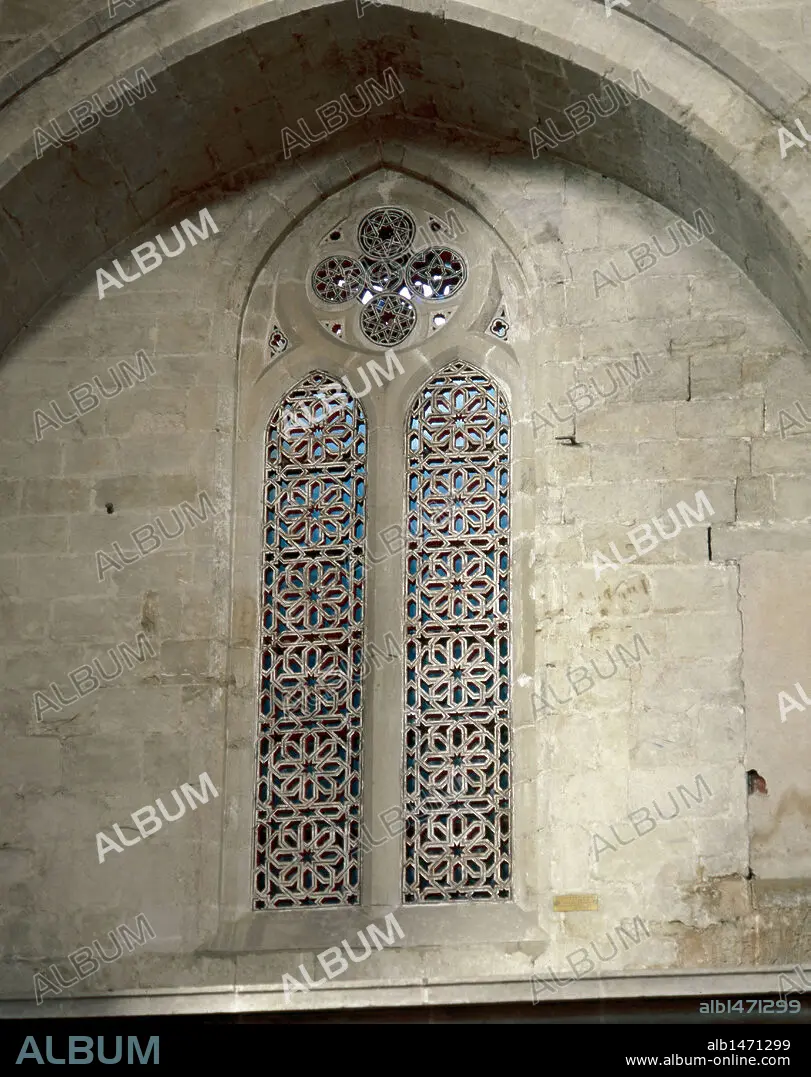 ARTE GOTICO. ESPAÑA. CATEDRAL DE SANTO DOMINGO DE LA CALZADA. Detalle de un VENTANAL de arco apuntado con decoración de influencia árabe, ubicado cerca de la entrada del claustro. La Rioja.