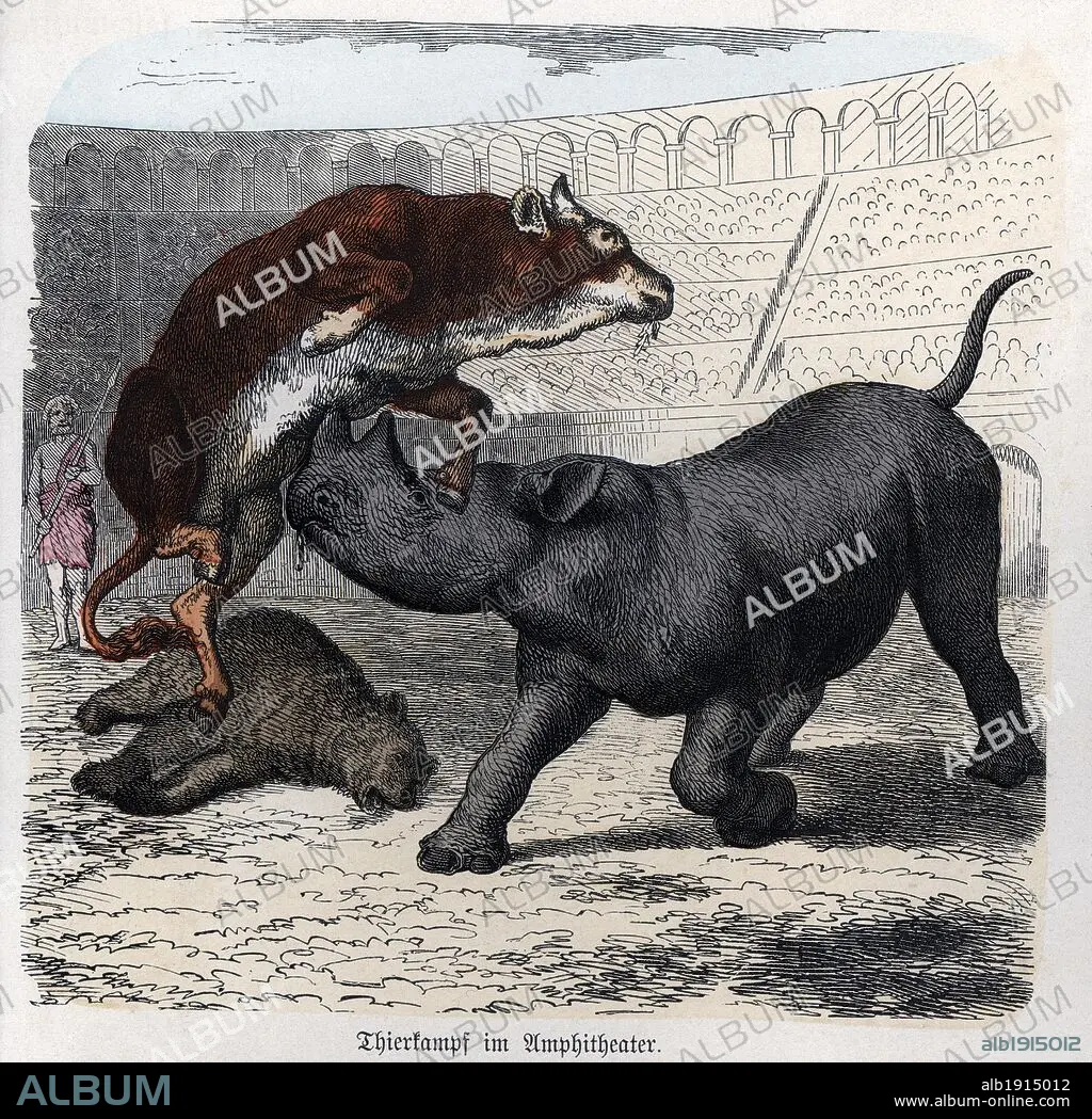 Historia Antigua. Roma. Circo romano, lucha entre animales y fieras. Grabado alemán de 1865