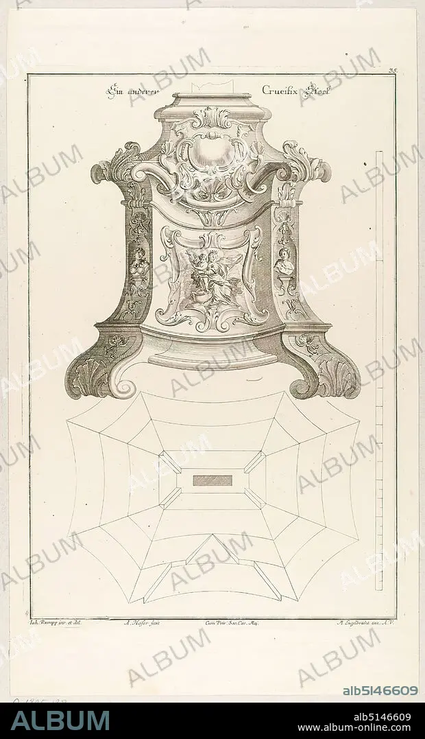 Martin Engelbrecht, Andreas Hofer, Johann Rumpp, ground and elevation of a crucifix base, copperplate engraving, sheet size: height: 36.2 cm; width: 21.7 cm, signed, numbered and inscribed in the plate: Another Crucifix Stick, Ioh. Rumpp inv. et del, A. Hofer fecit, Cum Priv. Sac. Caes. Maj, M. Engelbrecht exc. A. V, 35th, prints, printed matter, foliage and ribbon work, church furnishings, sculpture, sculpture, sculpture art, handicrafts, arts and crafts, industrial design, ornaments, rococo, sheet 35 from the series Unterschiedliche neue sehr nutliche Tischler oder Schreiner Risse inventirt u zeichnen von Johannes Rumpp von Kircheimh unter Teckh, published by M. Engelbrecht, Verlagsnummer 6.