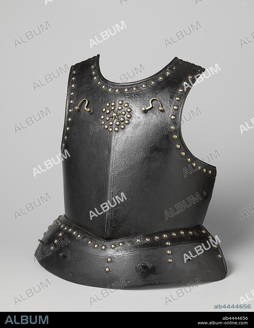 Breastplate of iron kuras, Breastplate, painted black, made of two plates, the arm and neck cut-outs flanged around, at the height of the arm cut-out two copper swivel hooks and copper knobs for attaching the shoulder straps. Two pins on either side of the neckline. Straight midbone, with a small bulge below. In the center of the breastplate a copper star surrounded by copper rivets. Parallel to the flanged edge, copper rivets and double decorative lines. The abdominal collar is riveted to the breast plate and has four pierced eyes for attaching the thigh plates. Parallel to the top edge of the belly collar, copper rivets. Double decorative lines above and below the rivets. Four round holes at the bottom of the belly collar. The inside of the breastplate is painted black., anonymous, Netherlands, c. 1600 - c. 1699, borstplaat, klinknagels, h 40.3 cm × w 42 cm × l 16 cm.