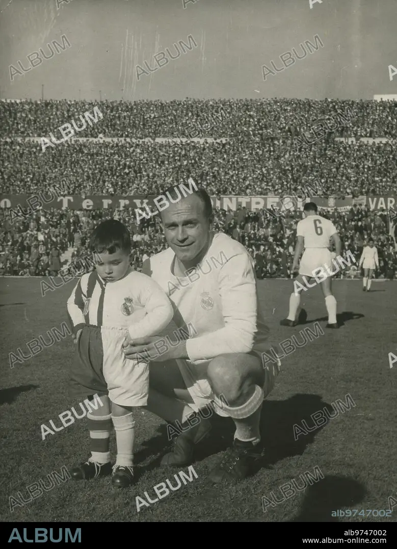 Descripción: 01/01/1959. Alfredo Di Stefano posa con un niño cuya camiseta es mitad del Real Madrid, mitad del Atlético de Madrid.