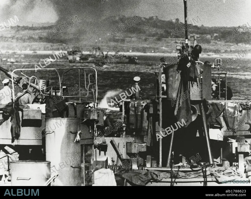 Descripción: SEGUNDA GUERRA MUNDIAL (1939-1945). GUERRA DEL PACIFICO (1941-1945). "UNOS OBSERVADORES SIGUEN EL BOMBARDEO EFECTUADO POR LAS UNIDADES DE MARINA EN LAS DEFENSAS JAPONESAS DURANTE EL DESEMBARCO AMERICANO EN LA ISLA DE OKINAWA" (31 de marzo de 1945), en el marco del enfrentamiento entre las fuerzas americanas y niponas durante la fase del conflicto en Extremo Oriente.