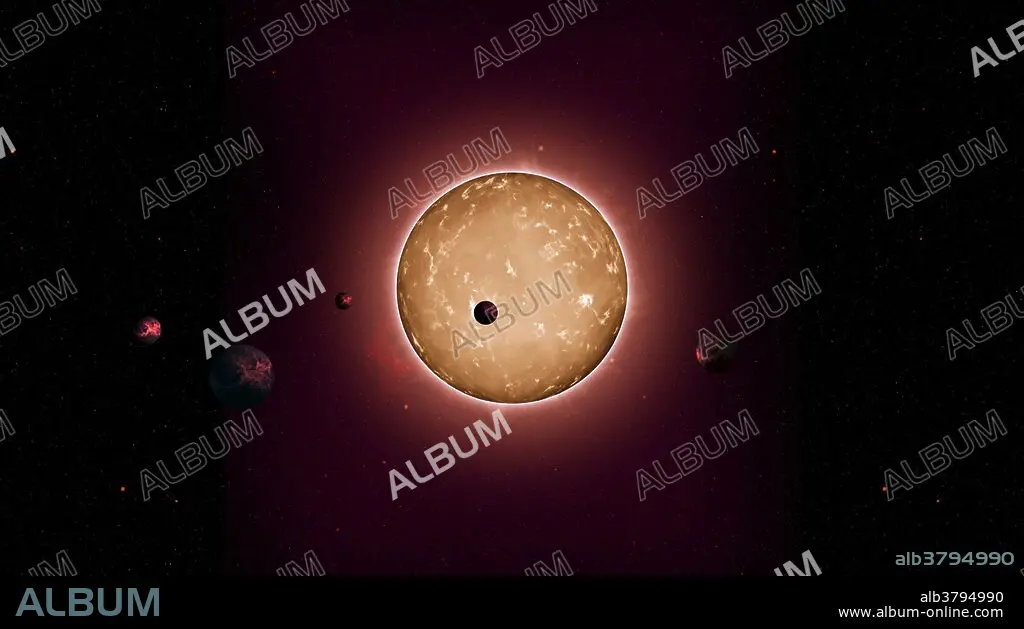 The tightly packed system, named Kepler-444, is home to five small planets in very compact orbits. The planets were detected from the dimming that occurs when they transit the disk of their parent star, as shown in this artist's conception. NASA Ames manages Kepler's ground system development, mission operations and science data analysis. NASA's Jet Propulsion Laboratory in Pasadena, Calif., managed Kepler mission development. Ball Aerospace & Technologies Corp. in Boulder, Colo., developed the Kepler flight system and supports mission operations with JPL at the Laboratory for Atmospheric and Space Physics at the University of Colorado in Boulder. The Space Telescope Science Institute in Baltimore archives, hosts and distributes the Kepler science data. Kepler is NASA's 10th Discovery Mission and is funded by NASA's Science Mission Directorate at the agency's headquarters in Washington. Release date January 28, 2015.