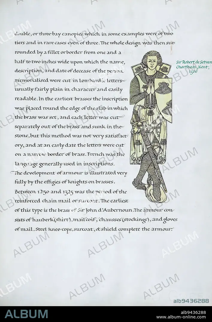 English Brasses, Illustration of Sir Robert de Setvans, Chartham, Kent, 1306, John Woodcock, a twentieth-century calligrapher, hand wrote, illustrated, and bound this book on English Brasses. The manuscript contains drawings of brass rubbings of many knights and nobles, including Sir John d'Abernon, Thomas de Hope, and Nichol de Gore, as well as noble women such as the wives of Reginald de Malyns, Nicholas Wadham, and Nicholas Wotton.