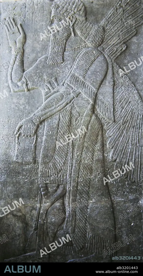 ARTE MESOPOTAMICO-ASIRIO. Relieve de un genio alado y escritura cuneiforme. Pieza realizada en piedra calcárea. Hallada en Nimrud, lugar de la antigua población asiria de Kalhu y datada en el siglo IX a. C. Vista lateral. Museo del Louvre. París. Francia.