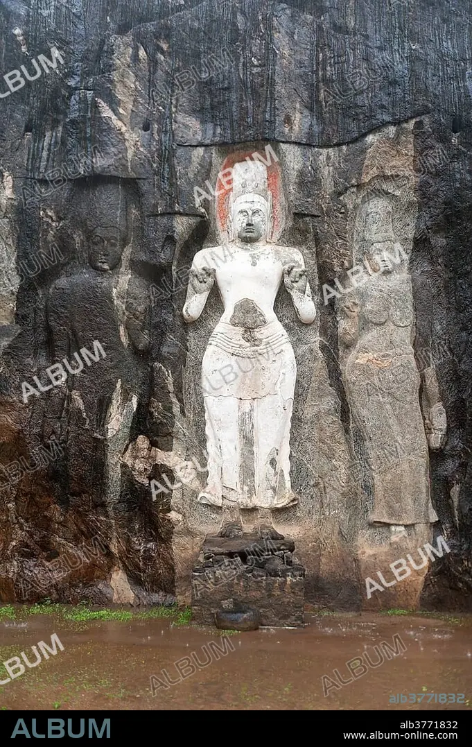 Shrine of Mahayana Buddhism, three old Buddha statues as rock reliefs, Avalokiteshvara in white, Tara on the right, Buduruvagala, Wellawaya, Monaragala Distrikt, Sri Lanka, Asia.