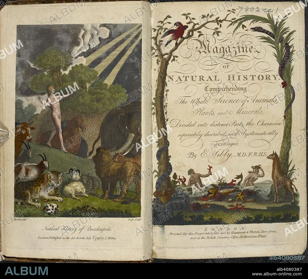 EBENEZER SIBLEY y J PASS. A naked man, Adam?, walking among animals. An universal system of natural history including the natural history of man, etc. (Magazine of Natural history ...). London, [1794-1807.]. Source: 1509/871 frontispiece and title page. Language: English.