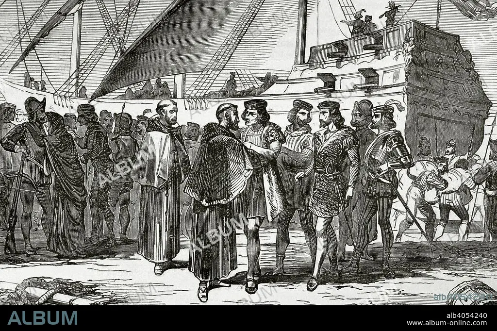 Descripción: Cristóbal Colón (1451? -1506). Navegante, almirante, virrey y gobernador general de las Indias Occidentales al servicio de la Corona de Castilla. Descubridor de América. Colón se embarca en el Puerto de Palos de la Frontera, Andalucía el 3 de agosto de 1492 para descubrir América. Dibujo por Fernando Miranda, detalle. Grabado por Sierra. Crónica General de España, Historia Ilustrada y Descriptiva de sus Provincias. Andalucía, 1867. Biblioteca Histórico Militar de Barcelona, Cataluña, España.