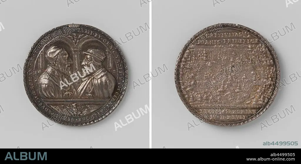 Imprisonment of Johan Frederik van Saksen in the battle of Muhlberg, medal in honor of Charles V and Ferdinand of Bohemia, Silver medal. Front: facing chest pieces of two men, violence in the background, above which is putto with two coats of arms, cut-out: putto with two coats of arms within a circle and decorative border. Reverse: battle with inscription, cut off: inscription inside decorative border., Battle of Muhlberg, Muhlberg, Charles V of Habsburg (German Emperor and King of Spain), Ferdinand I of Habsburg (German Emperor), Johan Frederik the Great (Elector of Saxony), Monogrammist WS (medailleur), Joachimsthal, 1547, silver (metal), founding, d 5.8 cm × w 57.44 gr.
