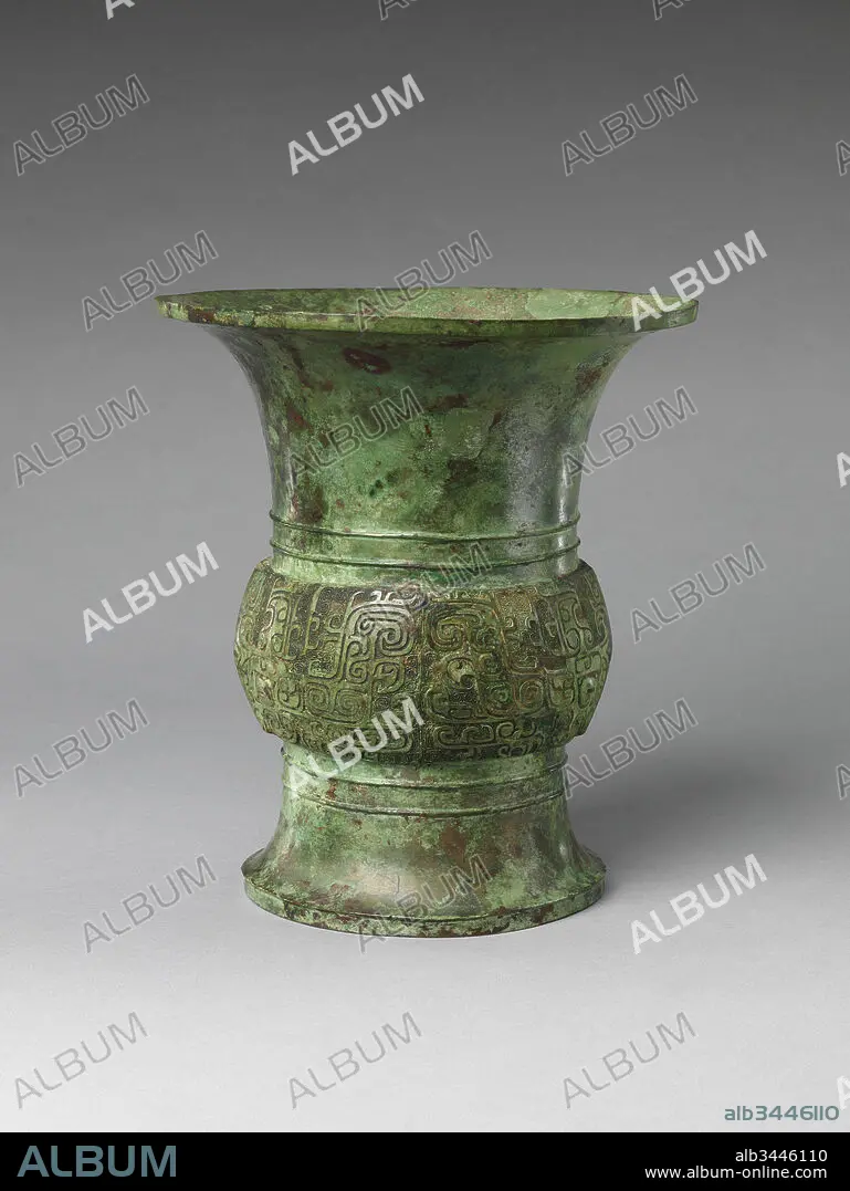 ? ???, Wine Vase (Zun), Shang dynasty (ca. 1600–1046 B.C.), 13th century BC, China, Bronze, H. 8 1/2 in. (21.6 cm); Diam. 7 5/8 in. (19.4 cm); Diam. of rim 7 5/8 in. (19.4 cm); Diam. of foot 5 1/4 in. (13.3 cm), Metalwork