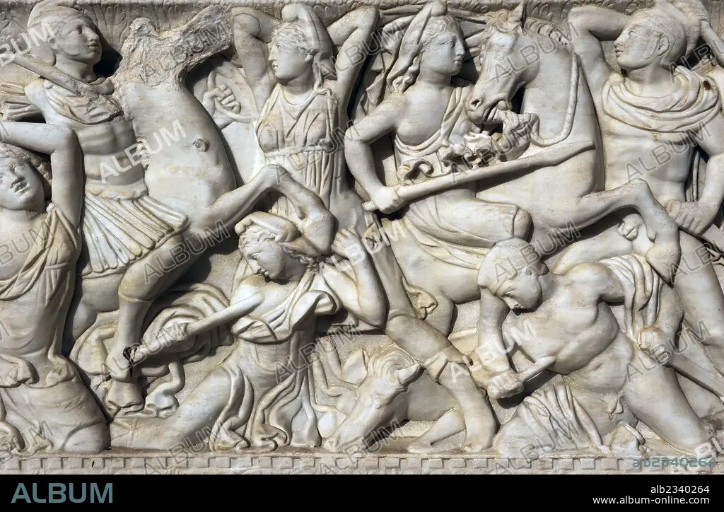 ARTE ROMANO. PROXIMO ORIENTE. ISRAEL. SARCOFAGO DE LAS AMAZONAS. Mármol. Tel Mevorah. Principios siglo III. Zona inferior: Narra la batalla entre griegos y amazonas. Museo Rockefeller (Museo Arqueológico). Jerusalén. Israel.