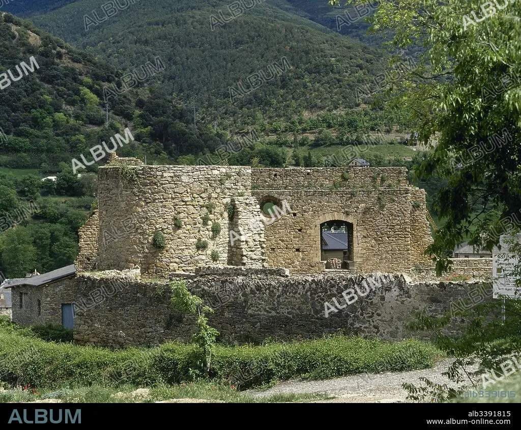 Castillo de los Condes de Pallars. Ruinas de la fortaleza documentada en el año 1281. Se asienta en lo alto de la población de Sort. Provincia de Lleida. Comarca del Pallars Sobirà. Cataluña.