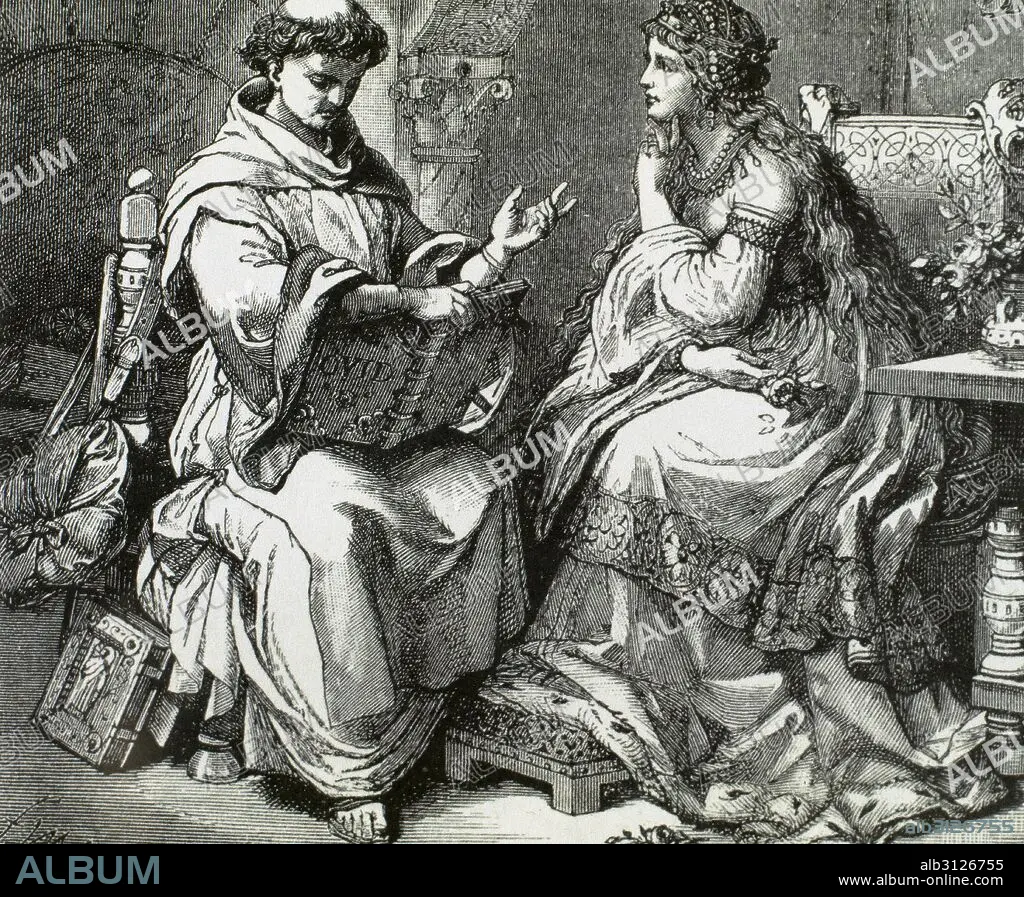 HISTORIA DE LA EDAD MEDIA. MONJE IMPARTIENDO CLASES DE EDUCACION RELIGIOSA A UNA JOVEN DAMA. Grabado del siglo XIX.