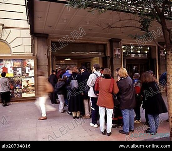FILA DE GENTE ESPERANDO EN LA TAQUILLA DEL CINE PALACIO DE LA MUSICA SITUADO EN LA CALLE GRAN VIA NUMERO 35