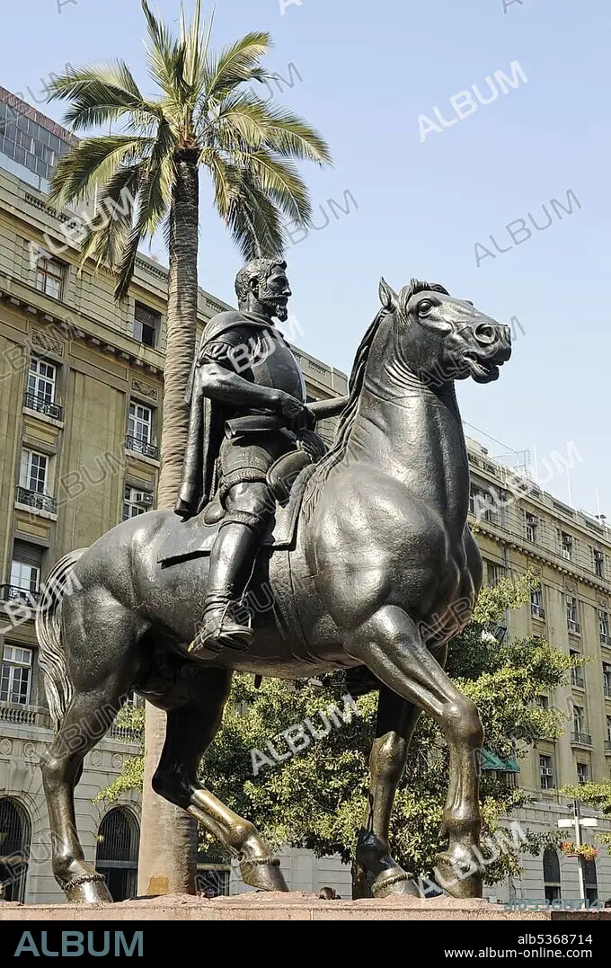 Don Pedro de Valdivia, Spanish conqueror, monument, equestrian statue, Plaza de Armas Square, Santiago de Chile, Chile, South America.