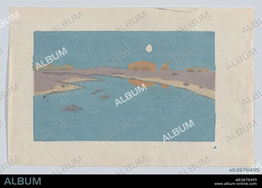 A leader of the American Arts and Crafts movement, Dow's advanced ideas concerning color and design are beautifully conveyed by his woodcuts. Born in Ipswich, Massachusetts, the artist studied tonalist painting in France for five years then returned to Boston in 1889. Fascinated by Ukiyo-e prints, Dow examined examples at the Museum of Fine Arts, together with Japanese printing equipment at the Smithsonian Institution. After mastering a multi-block process, he created forty compositions between 1891 and 1921, many printed in multiple variations with experimental inking. These works explore the expressive potential of color and, in 2016, the Museum acquired a significant group, including Marsh Creek. Exemplifying Dow's mature technique, no key-block was used in this print, and the landscape is formed from adjacent color zones. Printing the layers required great skill, and overlapping forms have been used to great effect. Thinly applied golden ink veils underlying blues and purples, with ripples scored into the wet ink -- a technique more common to watercolor than woodblock printing. Other variants of this subject use dark tones to suggest a moonlit scene, but the present example evokes bright twilight.