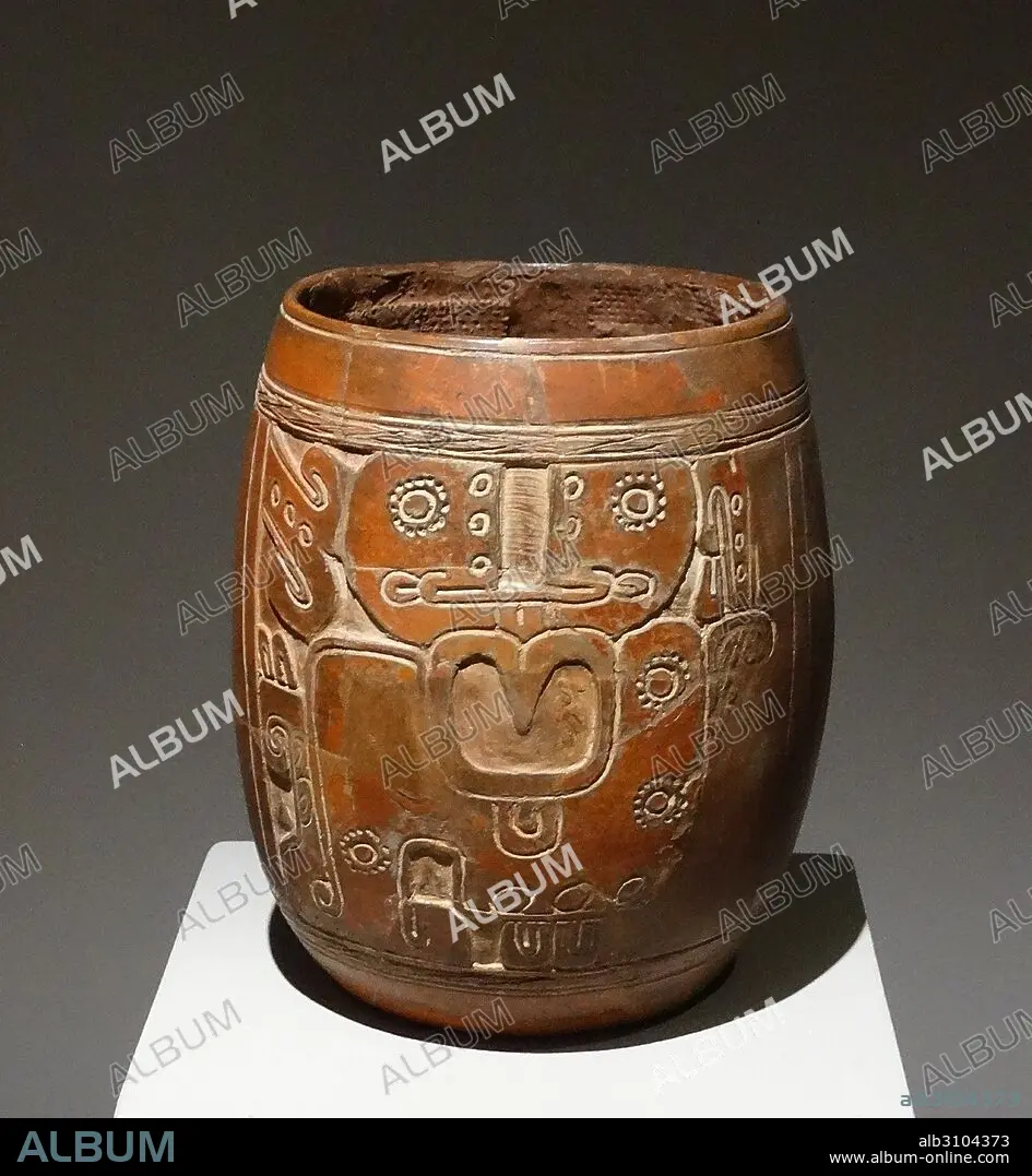 Mayan ceramic vase, with an engraved figure of a god with a large nose. Uxmal, Yucatan, Mexico 600-900AD.