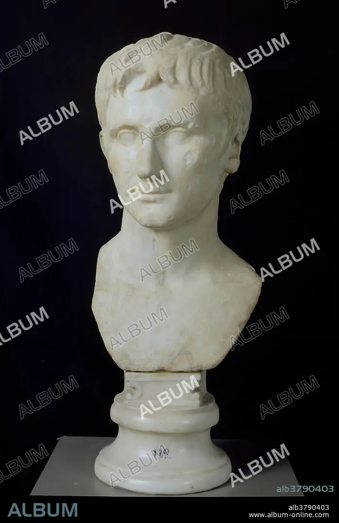 Descripción: Taller romano / 'El emperador Augusto (tipo Primaporta)'. 14 - 37. Mármol blanco, 67 x 29 cm.