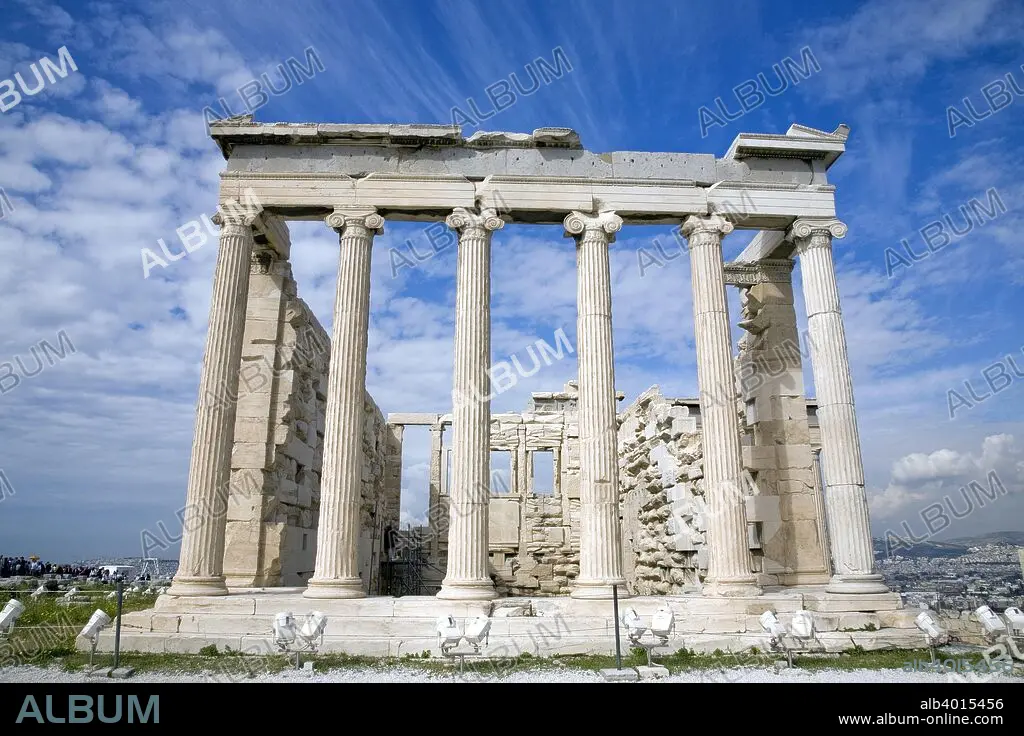 The Sanctuary of Athena, the Erechtheion, The Acropolis, Athens, Greece. The Erechtheion is an ancient Greek temple that was built in honour of the legendary King Erechtheus. The temple as seen today was built between 421-407 BC, and its architect may have been Mnesicles.