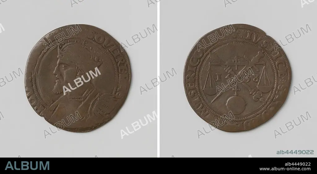 Armistice of Nice, calculation token in honor of Charles V, German Emperor, Copper Medal. Front: man's chest piece with crown inside inscription. Reverse: balance balanced under crown, therefor crossed scepter and sword, in between year, beneath that apple under cover, Nice, Charles V of Habsburg (German emperor and king of Spain), anonymous, 1538, copper (metal), striking (metalworking), d 2.9 cm × w 4.43 gr.