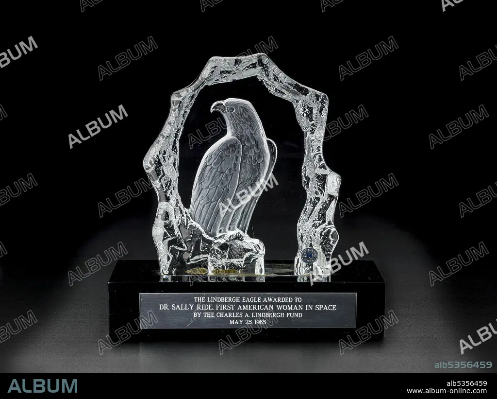 Lindbergh Eagle Award presented to Sally Ride, 1985. This Lindbergh Eagle award was given to Dr. Sally K. Ride in May 1985 to honor her achievement as the first American woman in space. Anne Morrow Lindbergh, widow of the famed aviator Charles A. Lindbergh, presented the award at a ceremony during Minneapolis' Lindbergh Heritage week. Lindbergh, who had often flown with her husband as a co-pilot, navigator, and radio operator, modestly declined the comparison made between herself and Ride as flight "pioneers," saying that Ride was more deserving of the title.