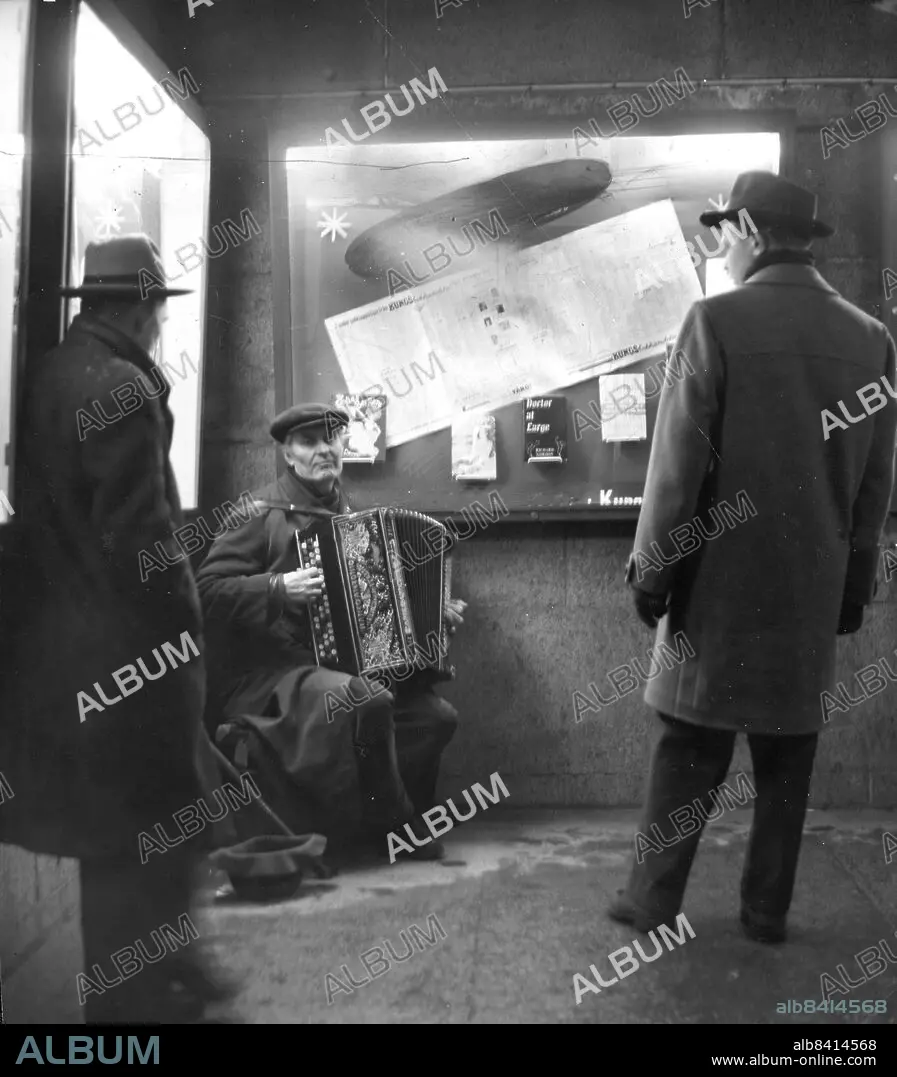 Stockholm 1955-12-31. Medan champagnekorkarna gav fyr på stans femtielva guldkrogar, Olof Widgren läste Nyårsklockan på Skansen och rikets alla domkyrkor ringde in det nya året i radion satt en gammal gatumusikant i trappan mellan Kungsgatan och Regeringsgatan och spelade Stilla natt, heliga natt på sitt illa medfarna dragspel. Foto: Folke Hellberg / DN / TT / Kod: 23. ** SvD OUT **