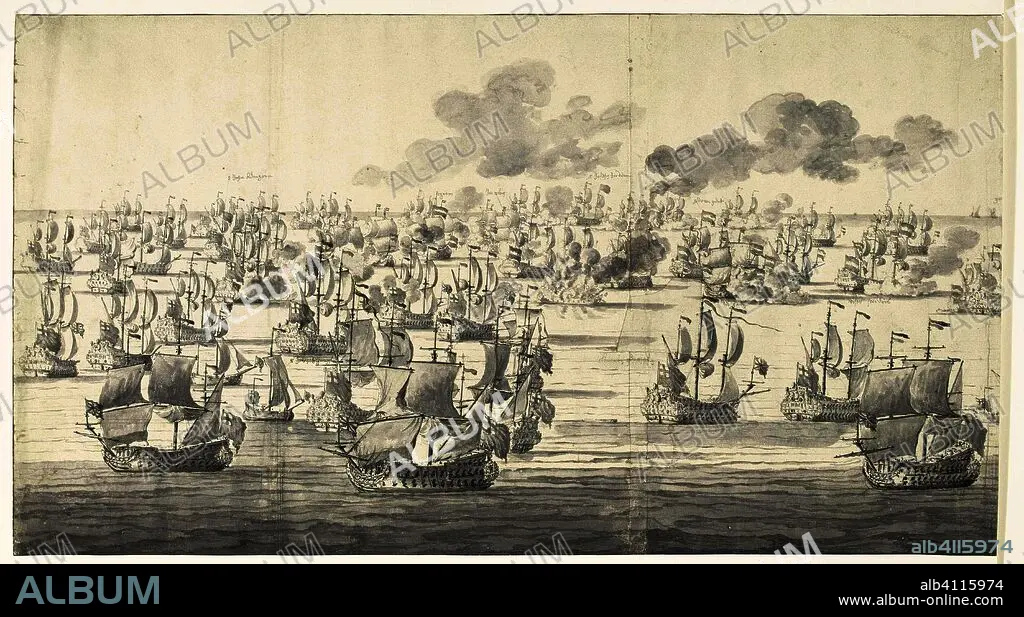 The Battle of Solebay, June 7, 1672, just after two o'clock in the afternoon, seen from the northwest: left part. Draughtsman: Willem van de Velde (I). Dating: 1673. Place: Northern Netherlands. Measurements: h 355 mm × w 649 mm.