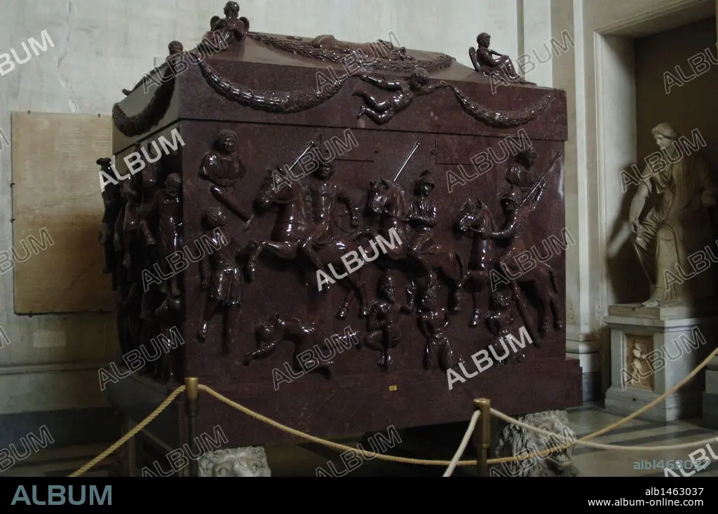ARTE ROMANO. BAJO IMPERIO. ITALIA. SARCOFAGO DE ELENA. Atribuido a la madre del emperador Constantino I. Obra realizada en pórfido rojo. Procede del Mausoleo de Elena. Los relieves recrean una escena de la primera mitad del siglo IV. Caballeros romanos con túnica corta, yelmo y armados con lanza realizan una carga contra tropas de bárbaros en huída. Altorrelieve. Fechada en el año 320. Museo Pio Clementino. Museos Vaticanos. Ciudad del Vaticano. Europa.