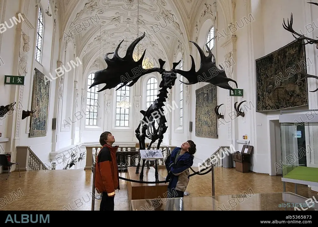 Children looking up in awe at a Megaloceros skeleton, Deutsches Jagd- und Fischereimuseum (German Hunting and Fishing Museum), Munich, Bavaria, Germany, Europe
