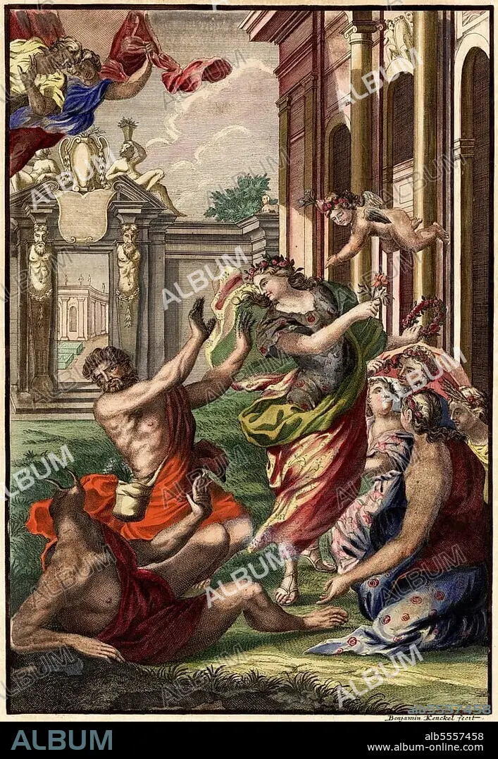 Hesperiden Nymphen im Kampf, Nürnbergische Hesperides, Nürnberger Hesperidengärten von Johann Christoph Volkamer, Nürnberg, Bayern, Deutschland, 1710, digital restaurierte Reproduktion einer Originalvorlage aus dem 18. Jahrhundert, genaues Originaldatum nicht bekannt.