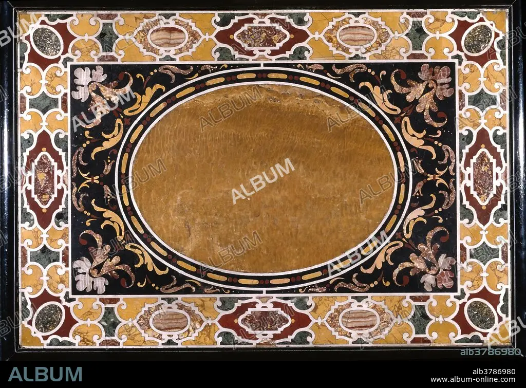 Descripción: Taller romano / 'Tablero de mesa con óvalo de alabastro'. Finales del siglo XVI. Alabastro, Paragone, Piedras duras u ornamentales, piedras preciosas, 87,3 x 128 cm.